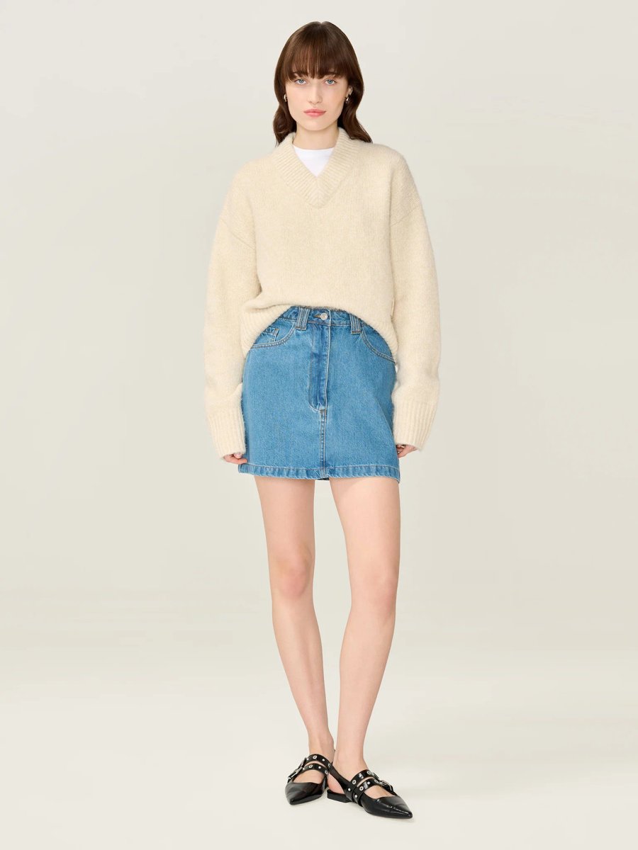 Designed in a soft mid-wash denim, Ottie brings a subtle A-line silhouette that flatters and fits with ease. Finished with simple yet sweet bow embroidery on the back pockets, this denim mini skirt is a playful nod to femininity with a clean, modern edge.