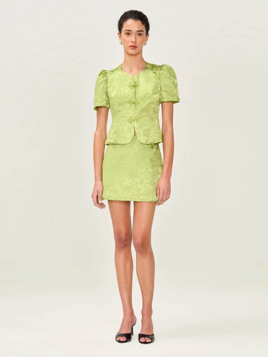 Vibrant lima bean green mini skirt, cut in a classic A-line silhouette. Crafted from rich floral jacquard with subtle texture and a soft sheen. Perfect for everyday wear, office settings, or light evening occasions.