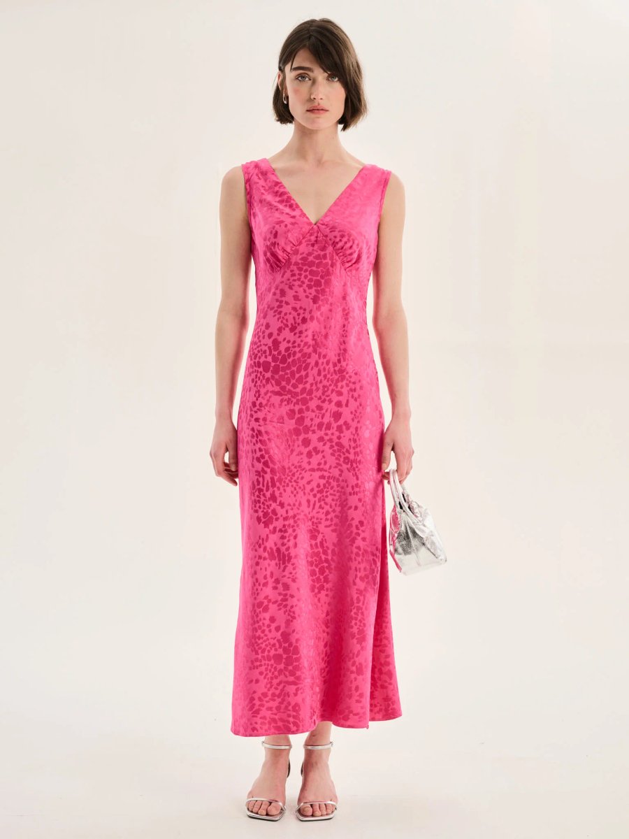 Designed for versatility, the Iris Maxi Dress features a cerise pink animal jacquard print and Empire Line cut. Crafted from soft and slinky LENZING™ ECOVERO™ Viscose fabric, it transitions seamlessly from work to weddings.