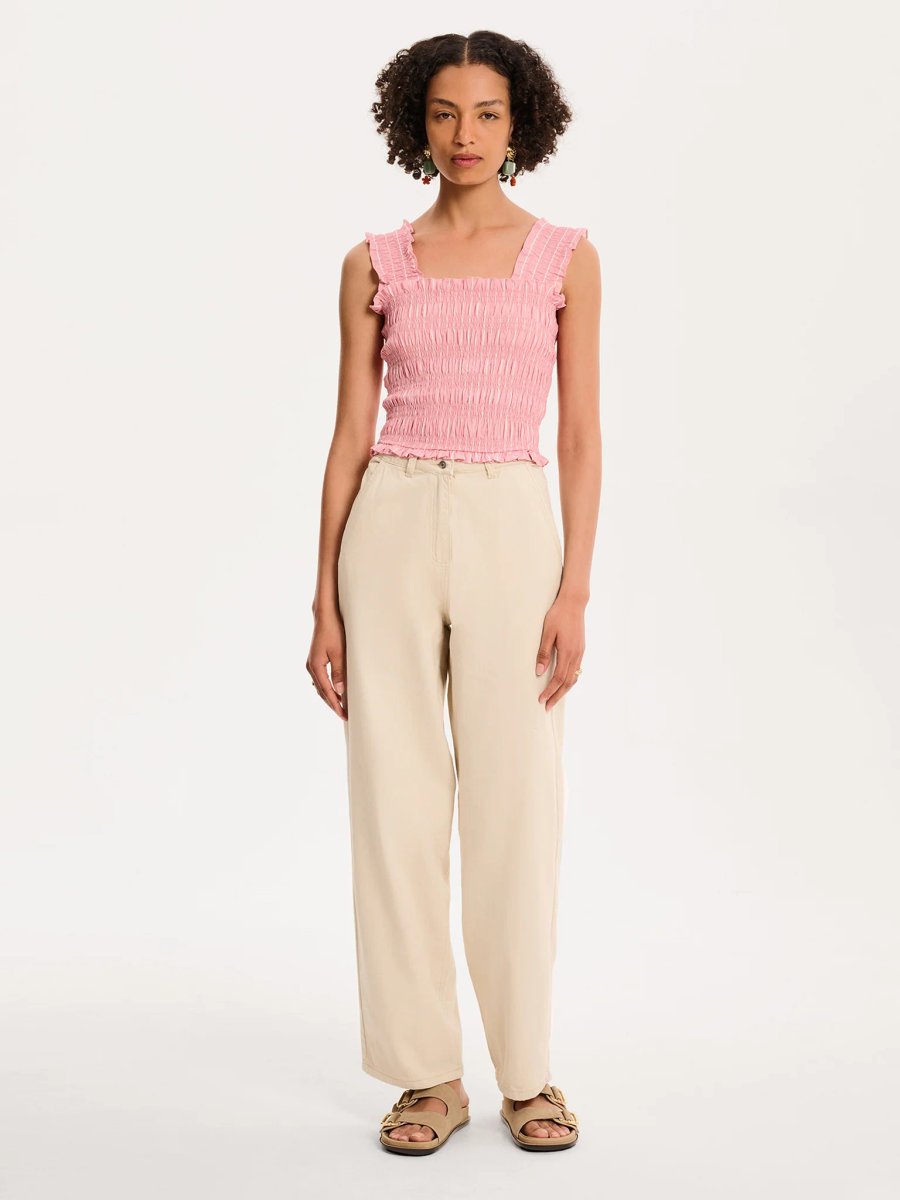The Macy top is a fun and feminine piece that brings a fresh twist to your everyday wardrobe. This cropped smock top features wide straps adorned with charming frills, adding a sweet, textured touch. The square neckline pairs perfectly with the pale pink pinstripe cotton.