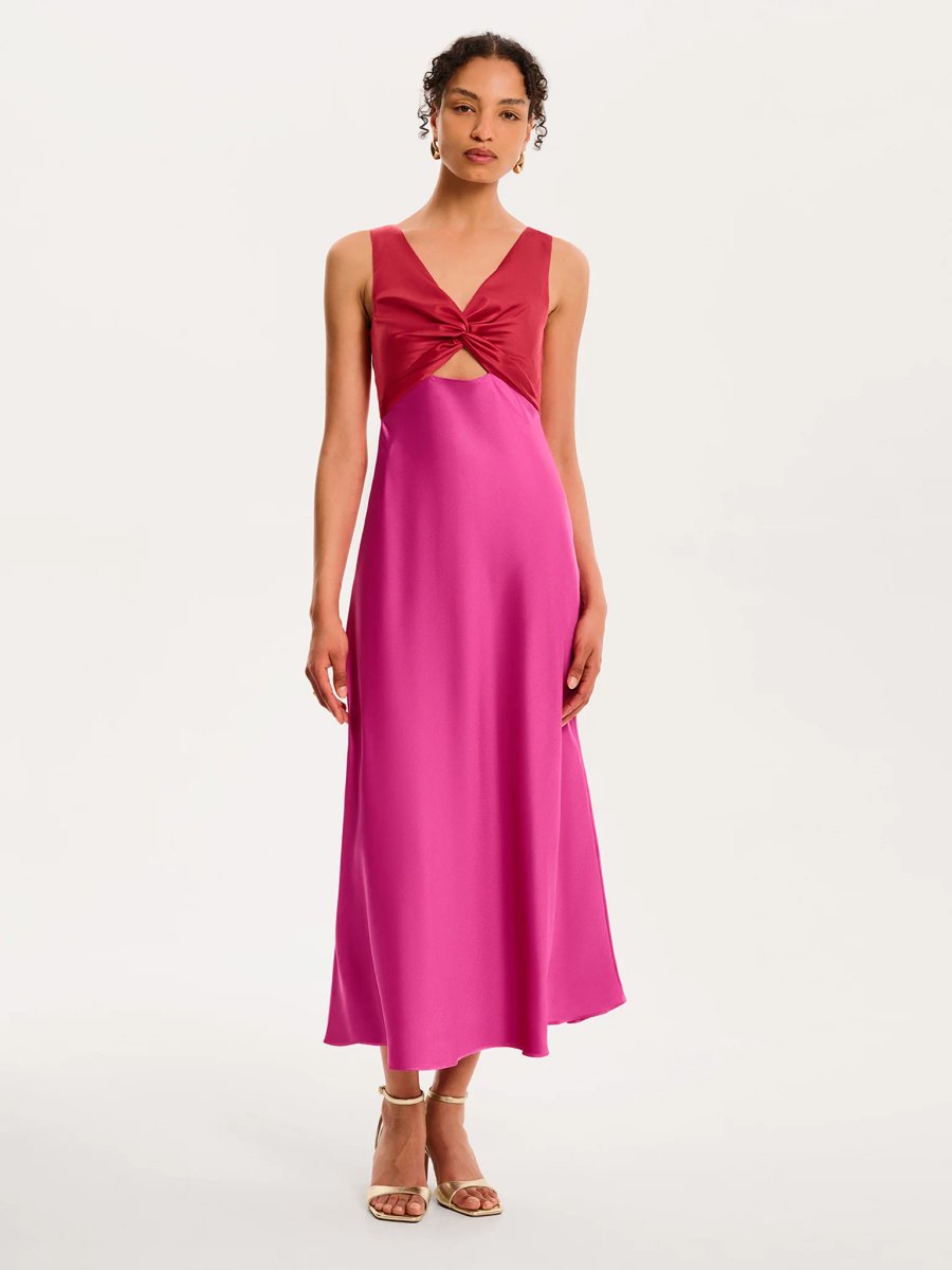 Designed with a bold two-tone effect, this midi dress features a twist front with a peek-a-boo detail mirrored by the cutout at the back. Finished with a decadent sash tie, this gorgeous satin effect dress is perfect for any occasion.