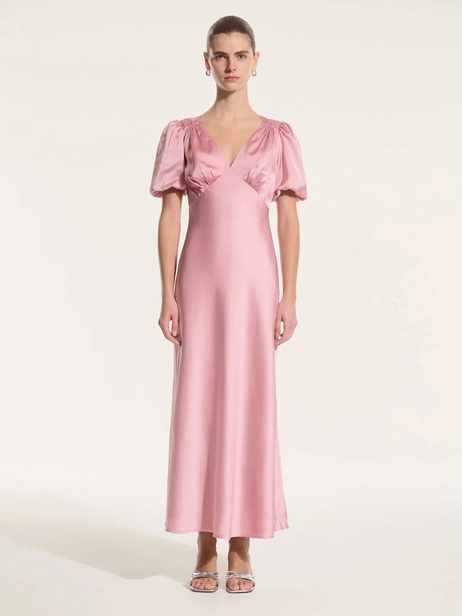 The OMNES Vintage Pink Satin Balloon Sleeve Maxi Dress is ideal for wedding-guest, date-night, evening.