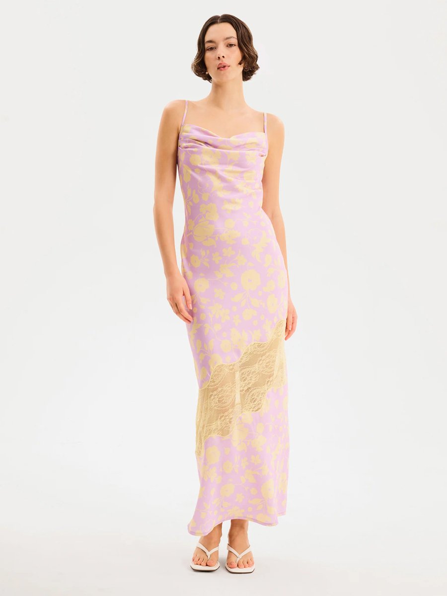 Designed with a soft lilac and yellow floral print, this midi dress features a graceful cowl front and an asymmetric lace panel in the skirt. The highlight of the design is the striking cutout at the back adorned with delicate lace details and a tie to add a fun extra frill. Perfect for a night out or a special occasion, this dress is the ultimate modern romance.