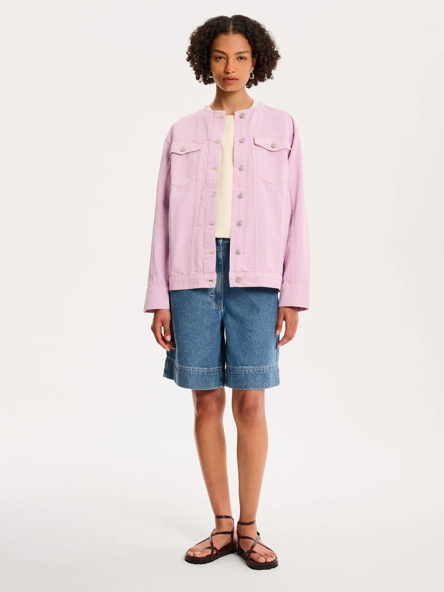 The Wilona Jacket is equal parts bold and feminine, crafted from soft lilac denim. With its oversized fit, this jacket offers a relaxed and comfortable silhouette, while the contrast stitching adds a touch of detail and dimension.