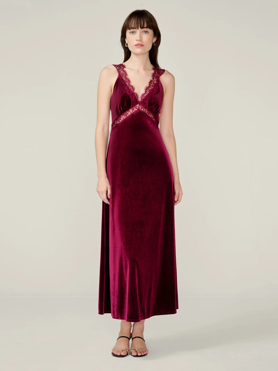 The OMNES Velvet Maxi Dress with Plunging Neckline in Deep Wine is available in sizes 10, 12, 14, 16, 18, 20, 22, 24, 4, 6, 8.