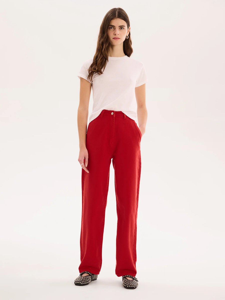 The Marlo jean from OMNES is a slim-fit dad jean crafted from ethically sourced BCI member cotton. It features a poppy red hue, adding a vibrant touch to your wardrobe.