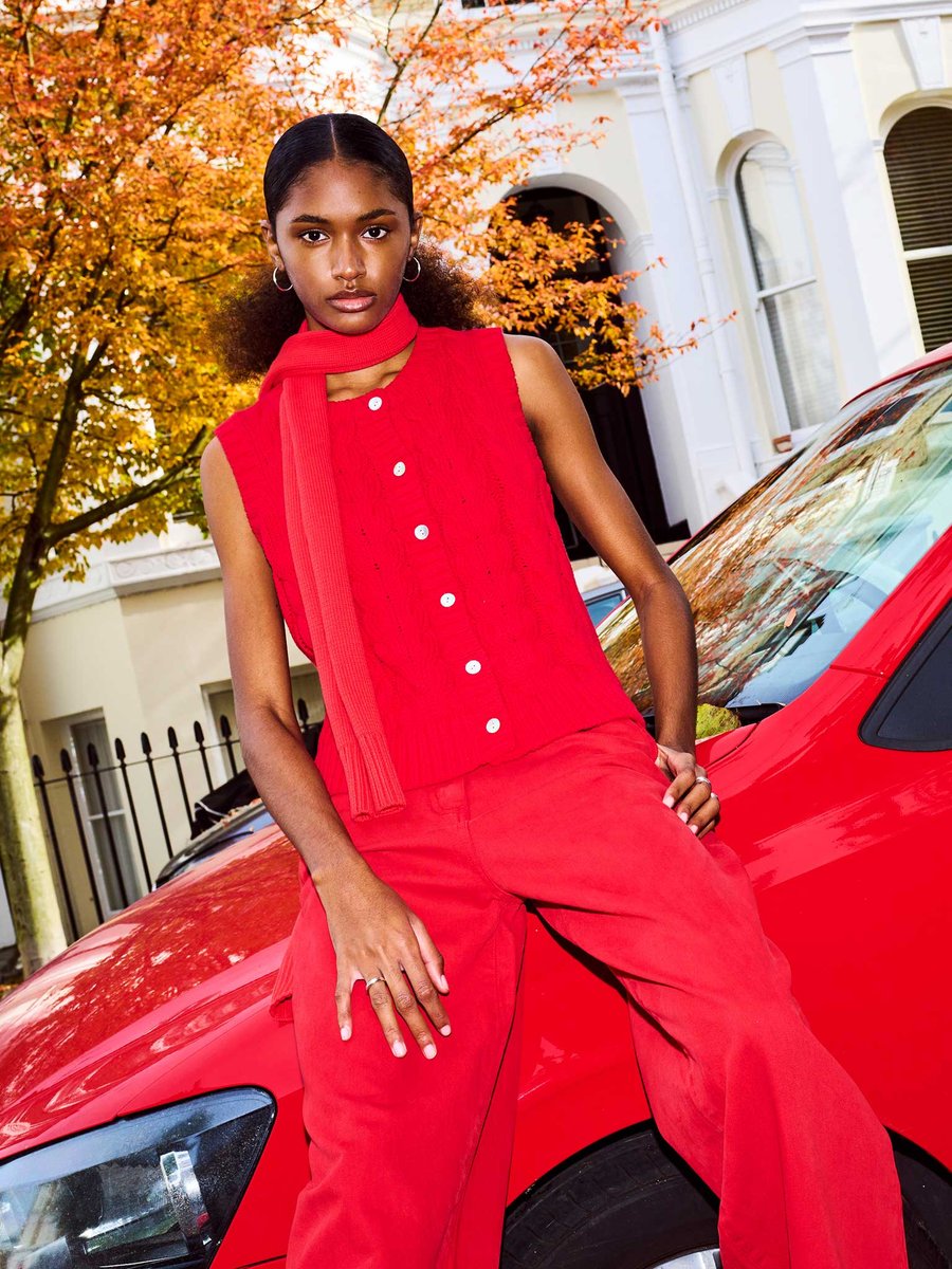 Designed with a timeless cable knit weave, this sleeveless vest in red is made from responsibly sourced cotton. Perfect for layering, it can be worn with a frilly blouse or a classic tee for versatile style.