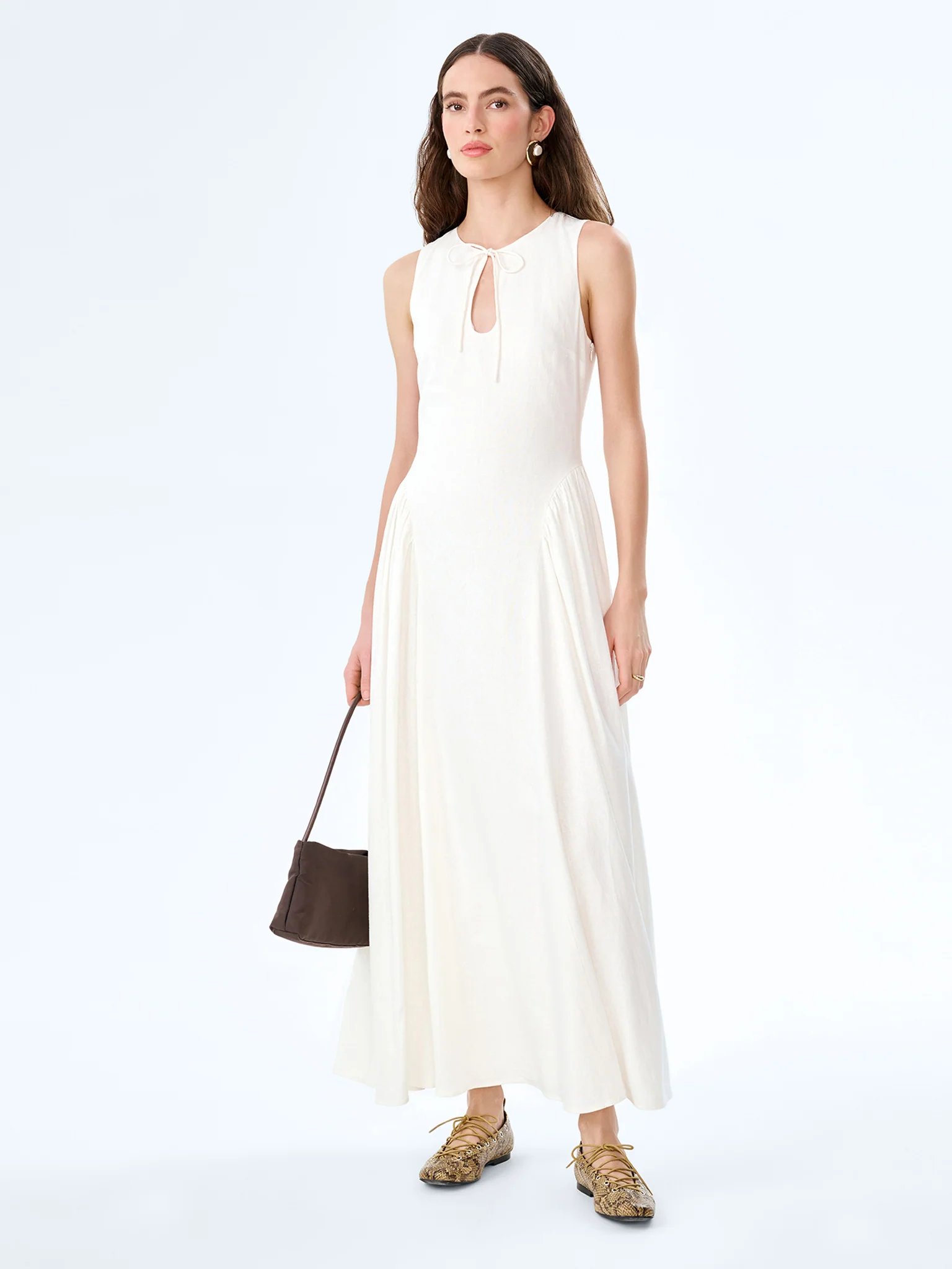 Designed in white, this sleeveless midi dress features a high neckline with a cheeky keyhole cut-out. The corset-style fitted torso defines the waist before falling into a drop-waist with a full skirt that balances the structure with softness. Tailored yet timeless, Margate is designed for days that turn into evenings.