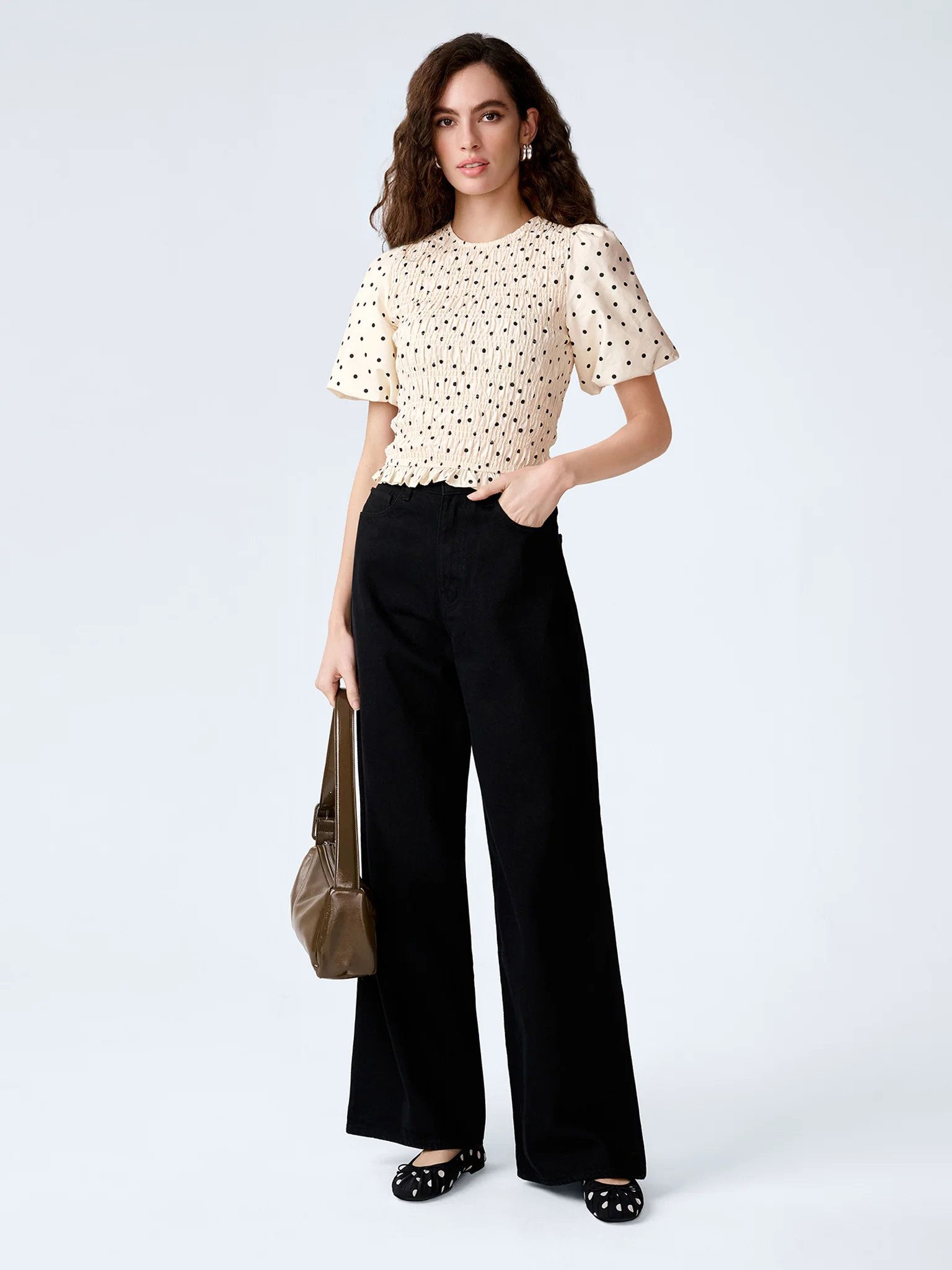 Pretty and playful, this Nicolla top will elevate your everyday basics. Crafted from soft white cotton in a polka dot print, it features shirring throughout, a short puff sleeve, and a soft peplum frill for an easy, feminine silhouette. Wear it, layer it, love it.