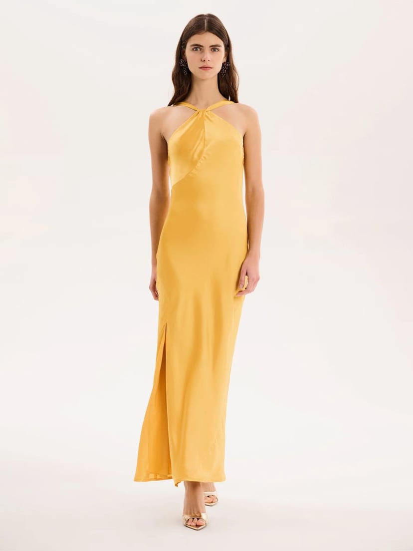 The OMNES Halterneck Dress with Twist Detail in Egg Yolk Yellow is ideal for evening, party, date-night.