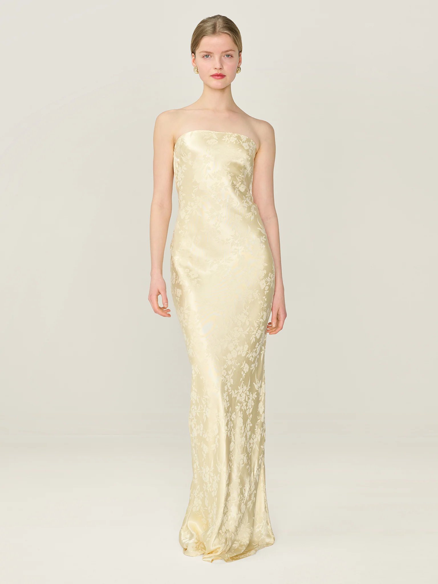 Simple, strapless, stunning; the Amdra is all that and more. Crafted from a LENZINGª ECOVEROª Viscose blend in a gorgeous butter yellow floral jacquard, she's fitted throughout to enhance the elegance of your figure. Designed to sit within our wedding edit, she would make a great bridesmaid dress whether you're sticking to a theme or mixing and matching across colours and silhouettes.