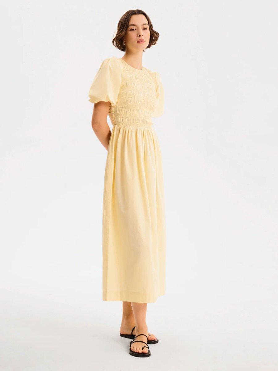Designed for versatility, the Terri Midi Dress by OMNES features a shirred bodice and short puff sleeves in soft butter yellow cotton. It effortlessly transitions from work to weekend.