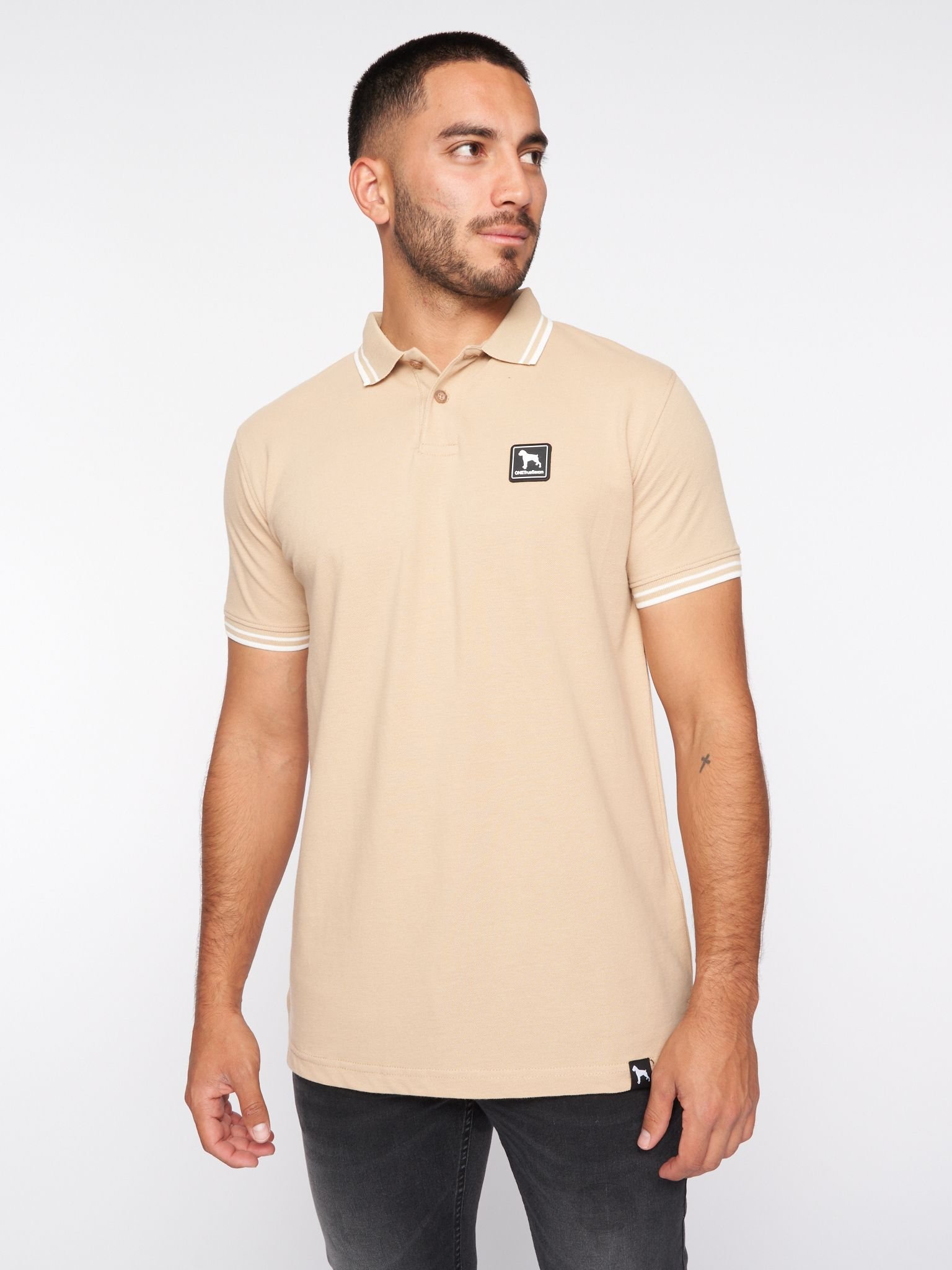 The One True Saxon Men's Dexon Polo in Stone is available in sizes 2XL, 3XL, L, M, XL.