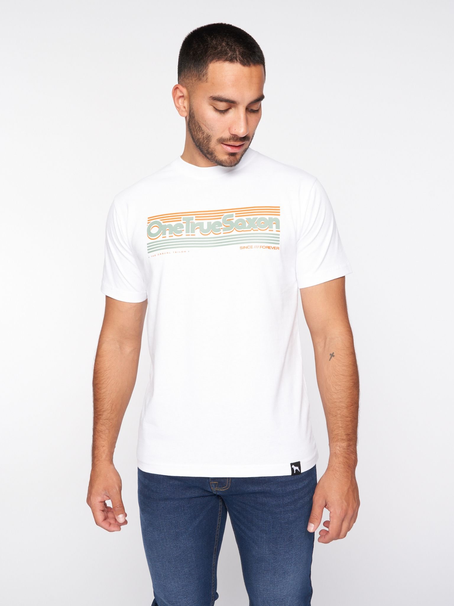 Timeless Men's One True Saxon Forever T-Shirt in white cotton with a classic crew neckline and short sleeves. The bold logo on the front makes a statement, while the regular fit ensures it suits all body types.