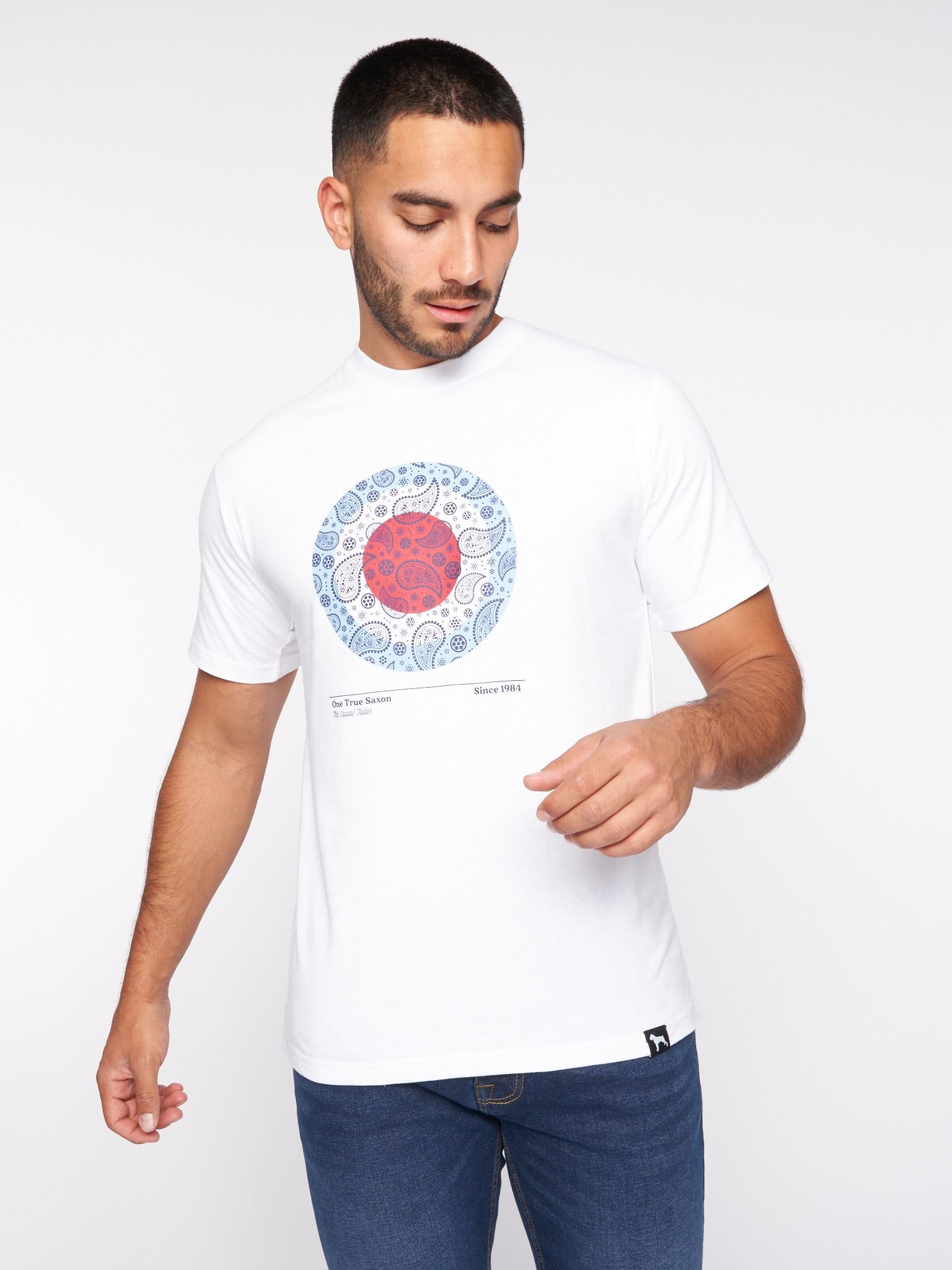The One True Saxon White Paisley T-Shirt for Men is available in sizes 2XL, 3XL, L, M, S, XL.