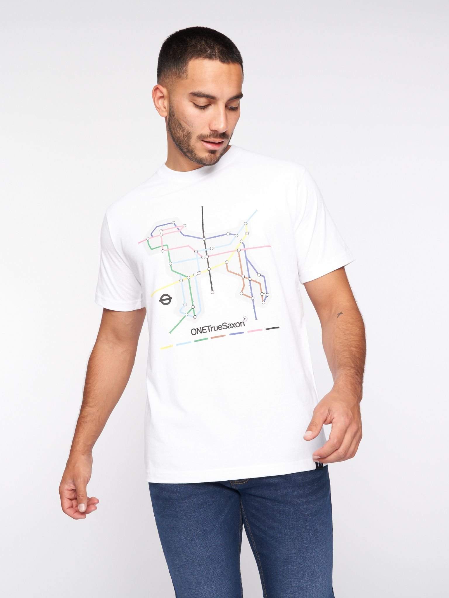 Upgrade your casual wardrobe with the Men's One True Saxon T-Shirt in White. Featuring a classic crew neck and short sleeves, this t-shirt offers both comfort and style. The front showcases a unique graphic of a dog outline formed by a colorful transit map, adding a modern and artistic touch to your look.
