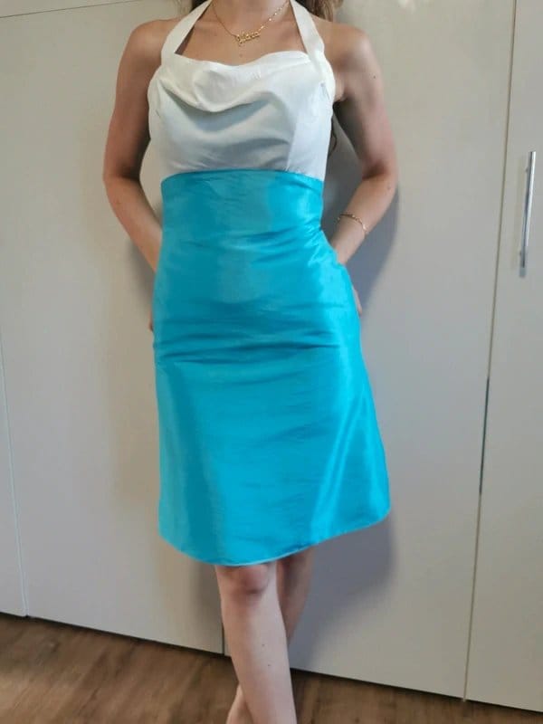 Elegant halter neck dress from Oriental Pearl featuring a soft ivory cowl neckline and fitted turquoise satin-look skirt. Lightweight and fully lined, crafted from 100% polyester with a beautiful sheen. Perfect for weddings, summer events or special occasions.