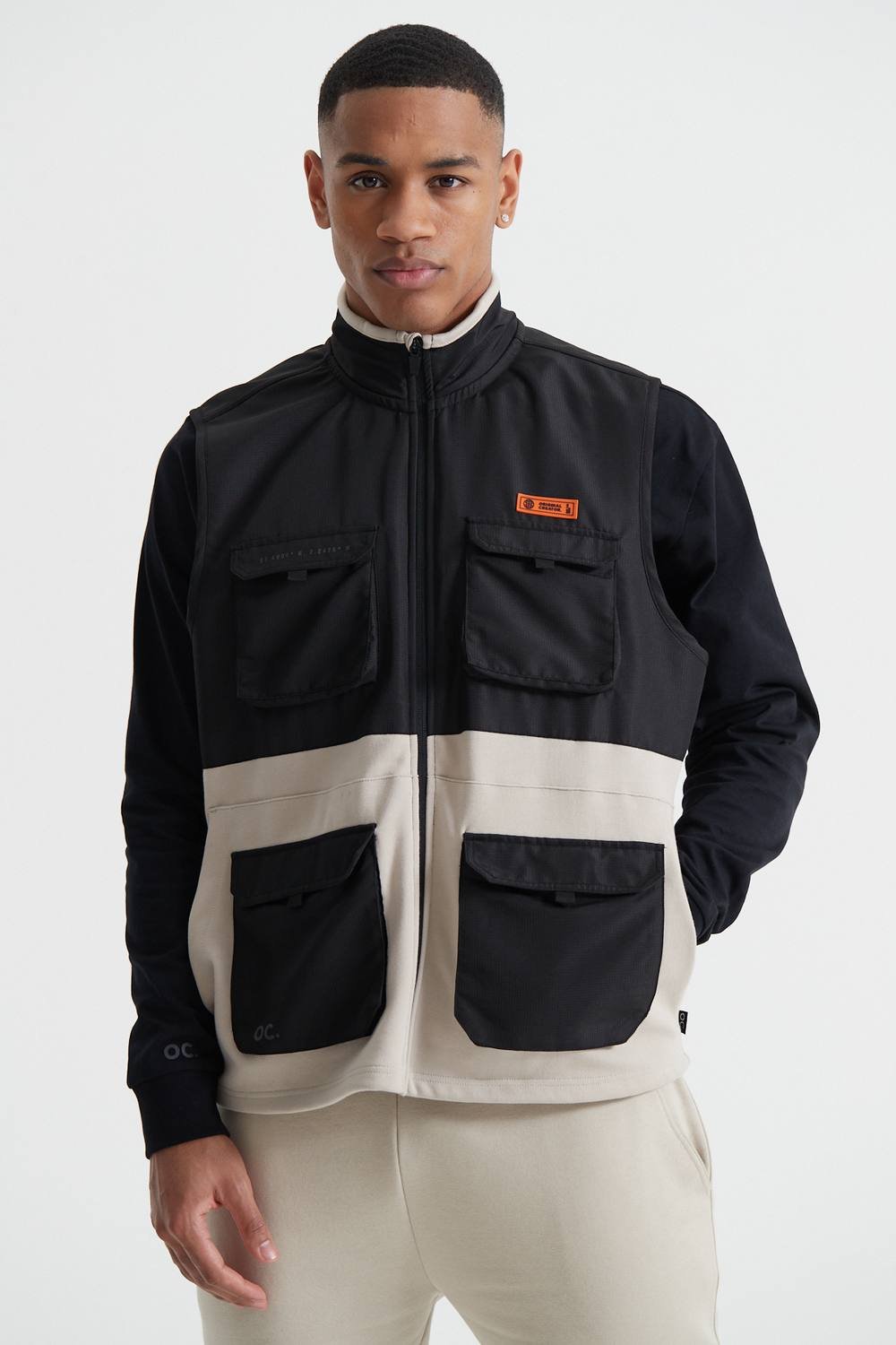 Multi-purpose cargo gilet in beige and black with a water-repellent finish. Features warm interlock fabric and multiple pockets for practicality. Ideal for sport or leisure.