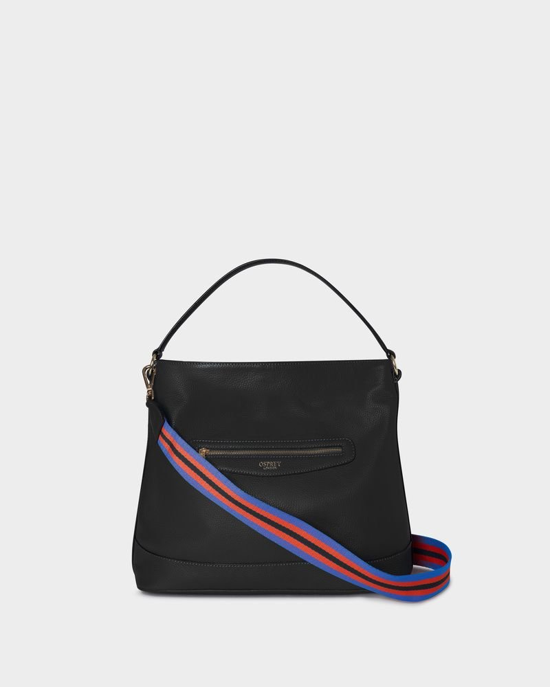 Iconic OSPREY LONDON hobo bag in black leather with a spacious design and slouchy silhouette. Features a zipper closure and a detachable strap with vibrant blue, red, and orange stripes.