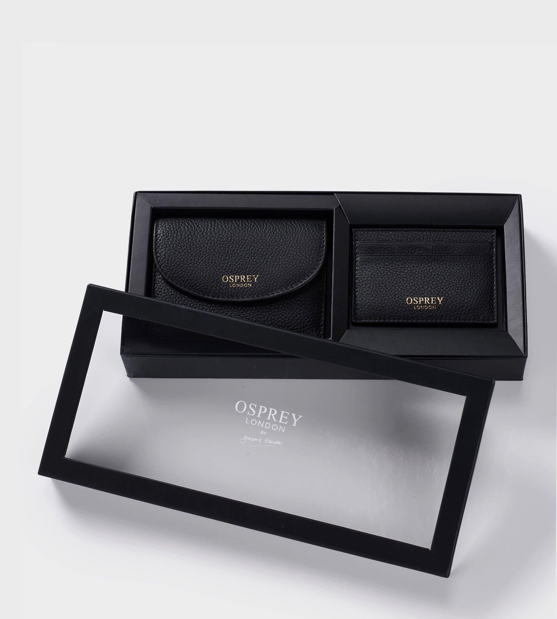 A luxurious black leather gift set from Osprey London featuring a Matinee Purse and a Cardholder. Presented in an elegant gift box, perfect for any occasion.