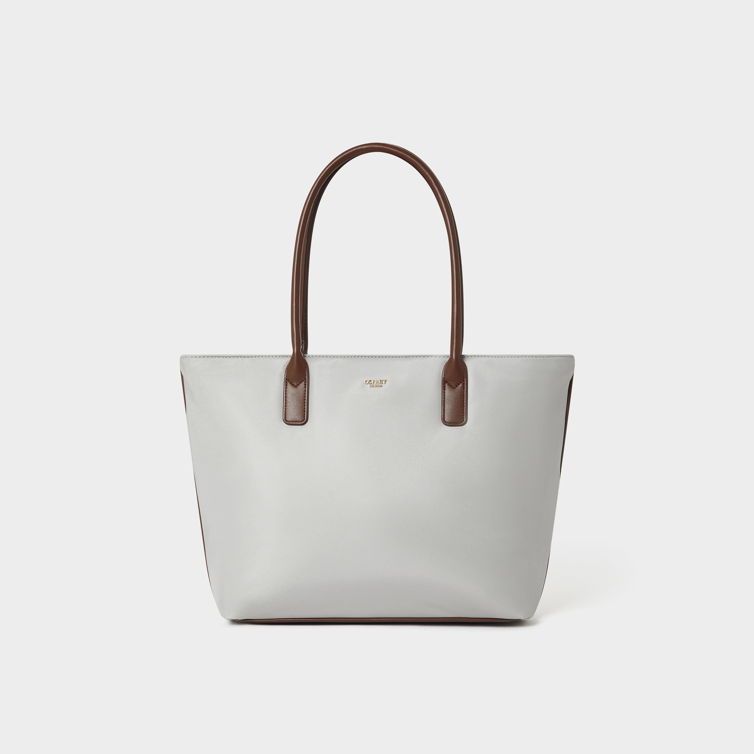 Versatile light grey nylon tote bag with faux leather handles and a zip-top closure. Ideal for office, gym, shopping, or overnight trips.