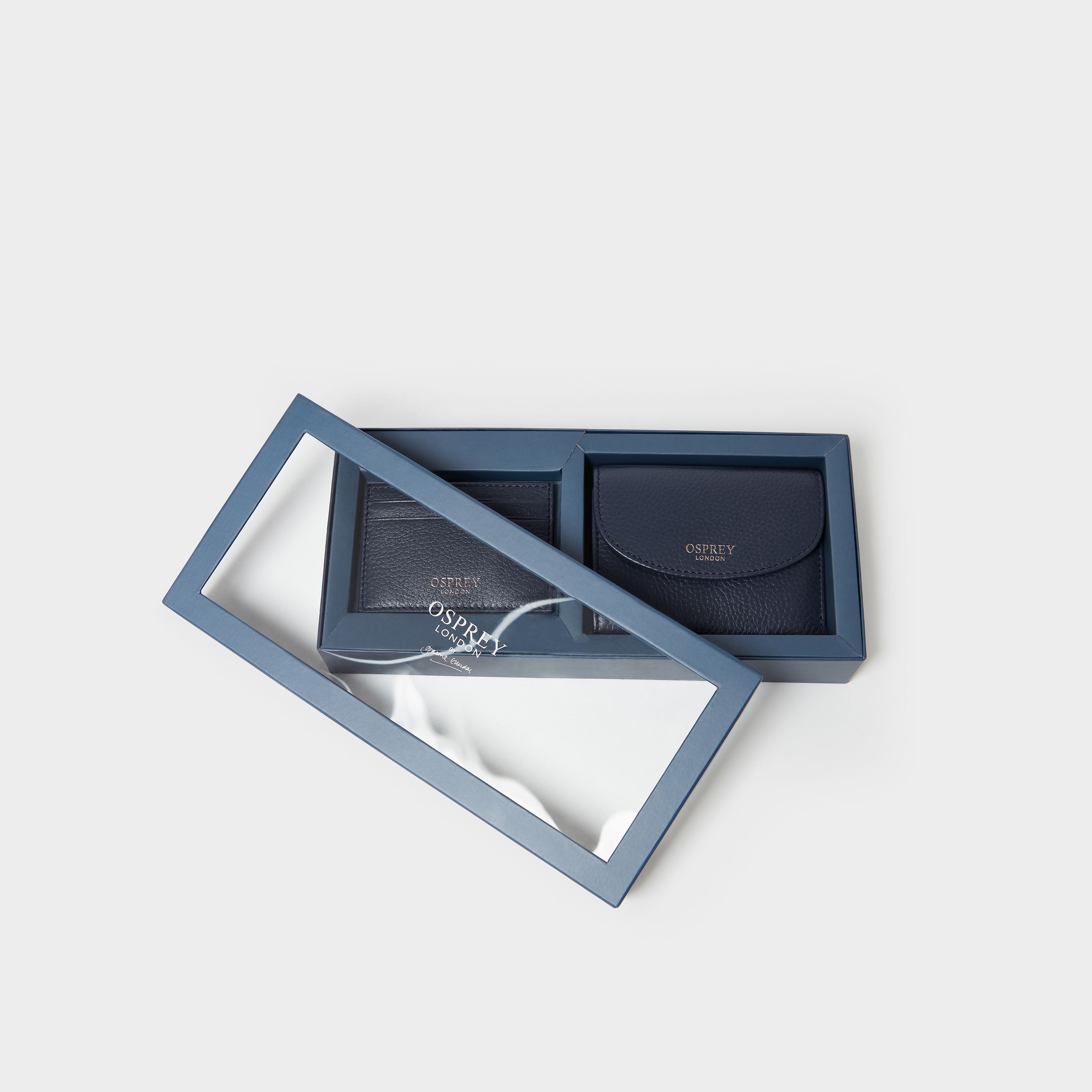 Elegant navy leather gift set from OSPREY LONDON. Includes a matinee purse and a cardholder, both in navy leather. Presented in a matching navy gift box.