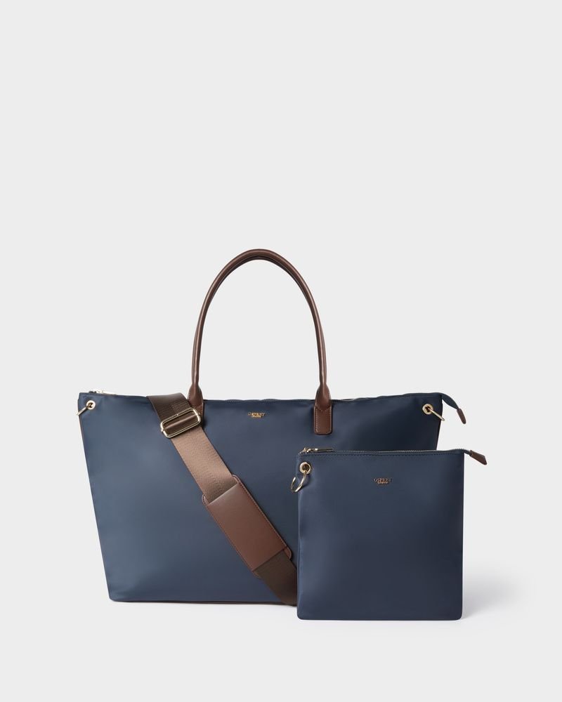 Stylish Navy nylon weekender bag from Osprey London. Features a water-resistant lining, interior pockets, and RFID protection. Comes with a matching Nylon pouch for added convenience.