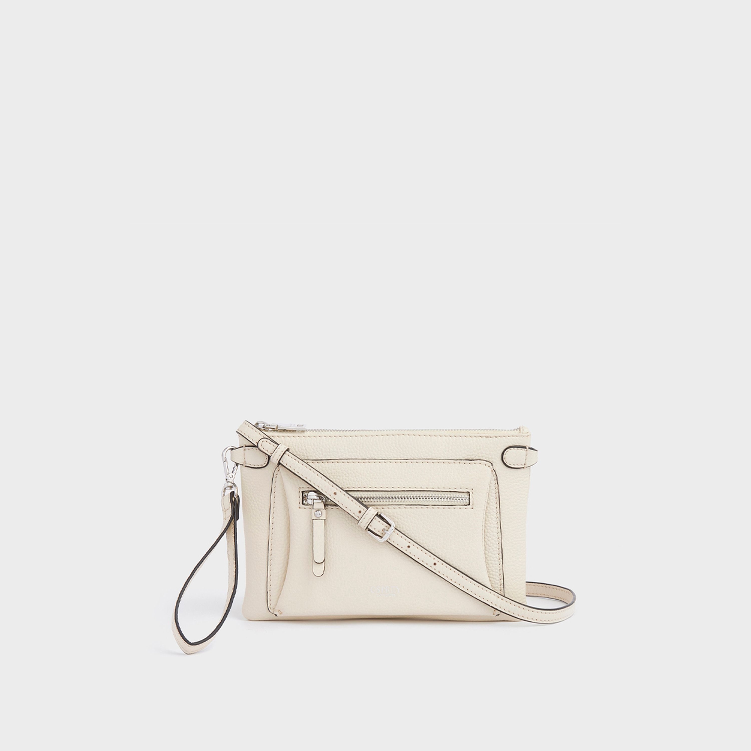 Elegant stone leather crossbody clutch by OSPREY LONDON. Features a compact design with inlaid pockets for organisation. Includes two detachable leather straps for versatile styling. Perfect for everyday use.