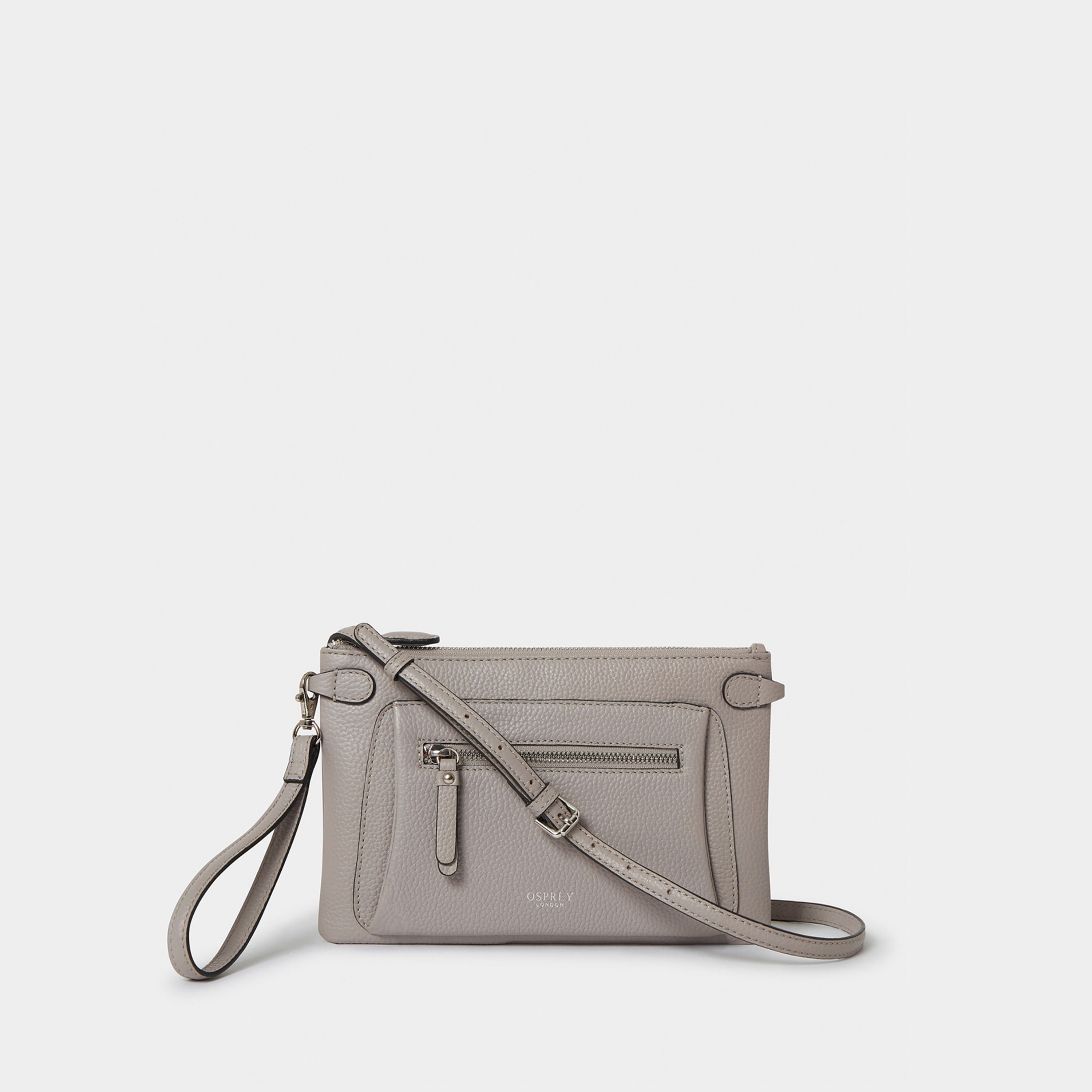 Stylish taupe leather crossbody clutch bag by OSPREY LONDON. Features a compact design with inlaid pockets for organisation. Perfect for everyday use with its detachable strap.