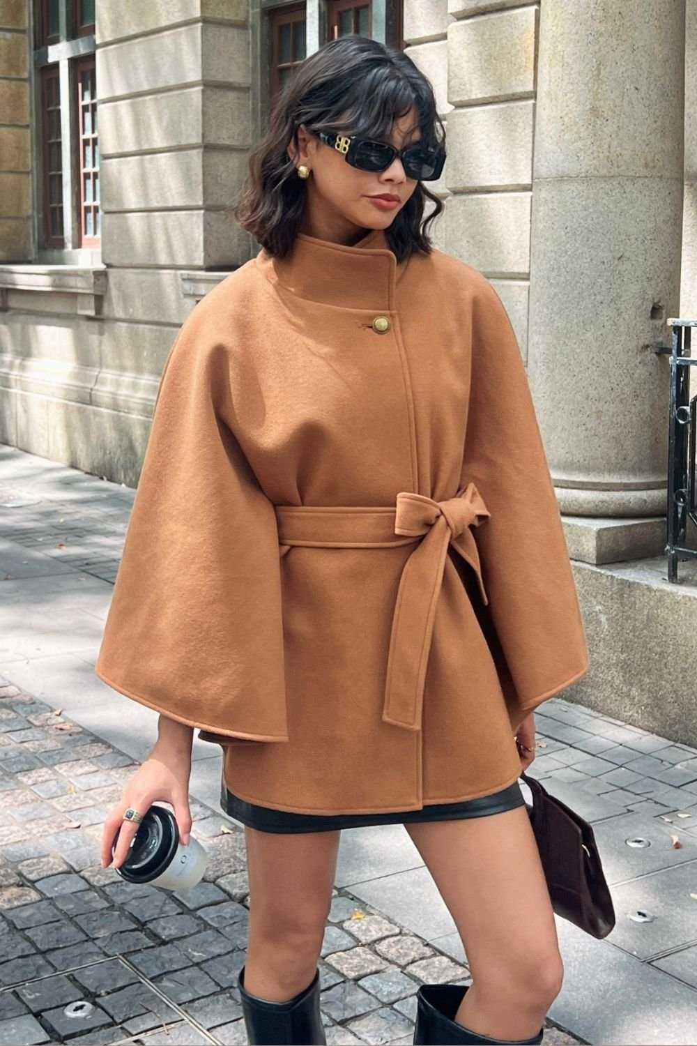 Stylish belted sleeveless wool cape coat in brown. Features a refined stand collar and a wide-fit silhouette. Perfect for a chic, modern, and timeless look.