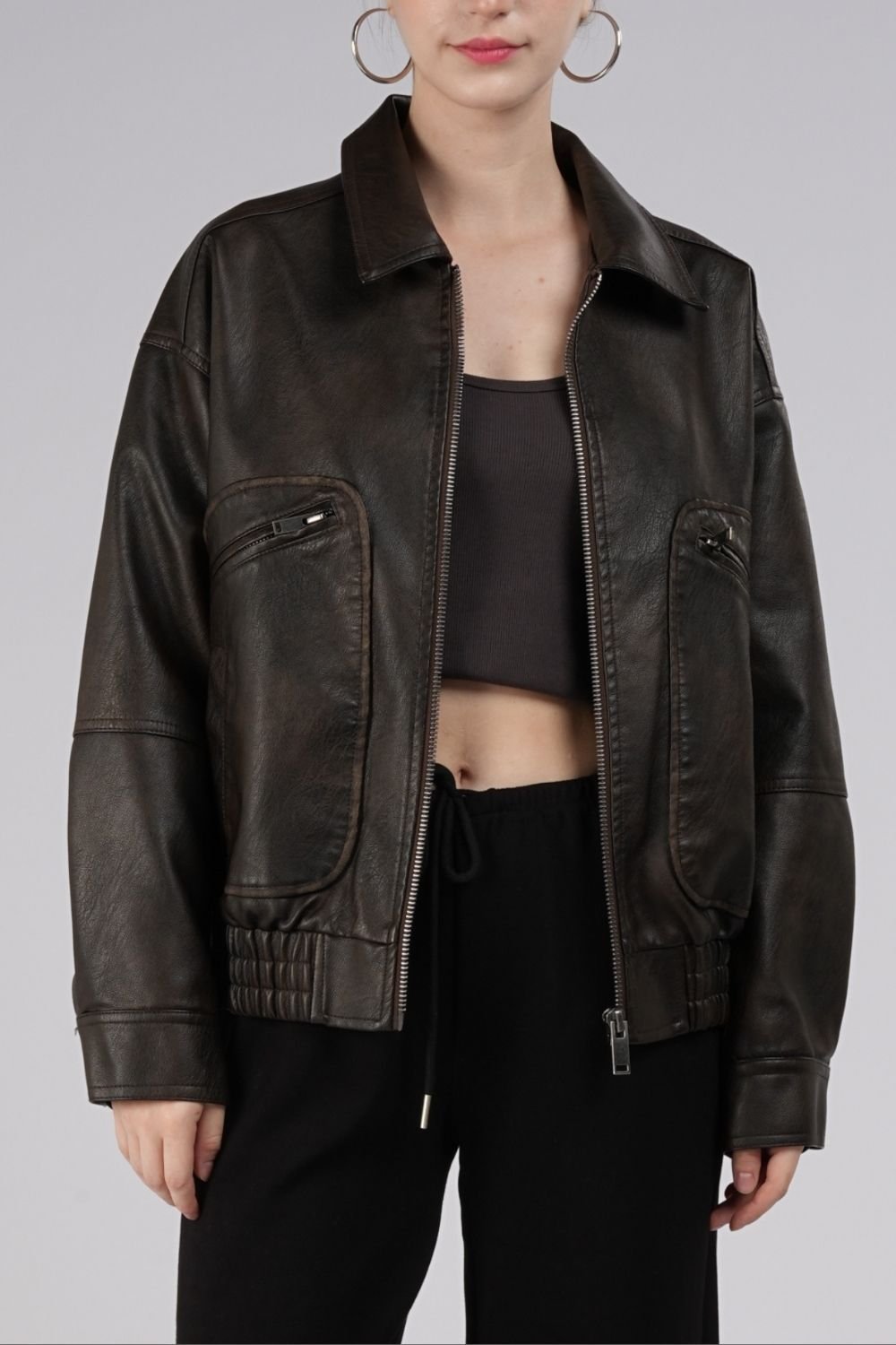 The OUTTA BOX Brown Faux Leather Bomber Jacket is ideal for casual, evening, date-night.