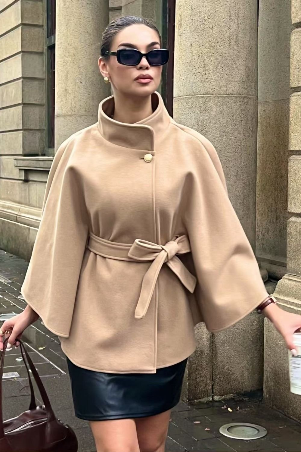 Stylish belted cape coat for women, featuring a sleeveless design and a refined stand collar. Made from a solid-colour wool-blend fabric, this coat offers a chic and modern silhouette. Ideal for a flattering and feminine look.