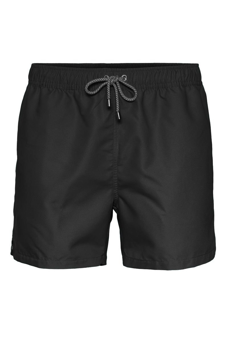 Classic swim short in black polyester with an elasticated waistband and external drawcord. Features a small coin pocket for convenience. Ideal for beach outings.