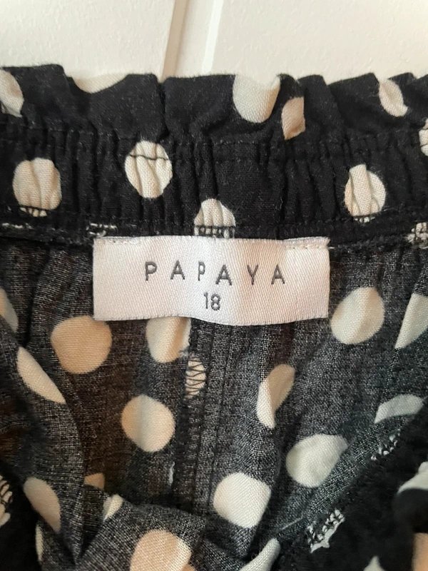Black and white spotty playsuit by Papaya. Comfortable and versatile, perfect for casual wear. Features a playful polka dot pattern and a relaxed fit. Ideal for everyday outings or relaxed gatherings.