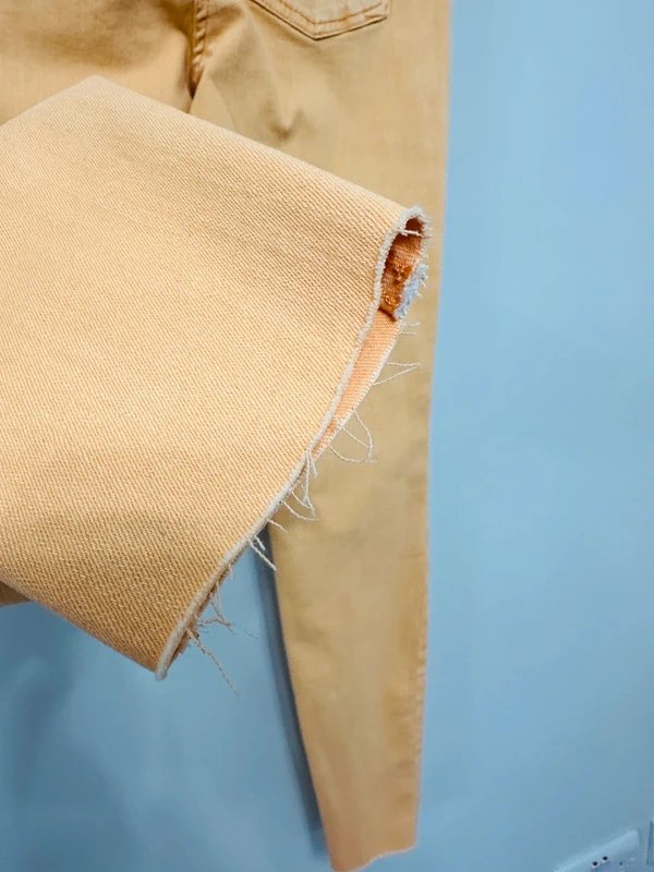 Designed in a soft orange/apricot colour, these skinny jeans feature a classic ankle grazer length with a raw hem detail at the bottom. They fasten with a zip and button and include belt loops, back pockets, and a small coin pocket at the front.
