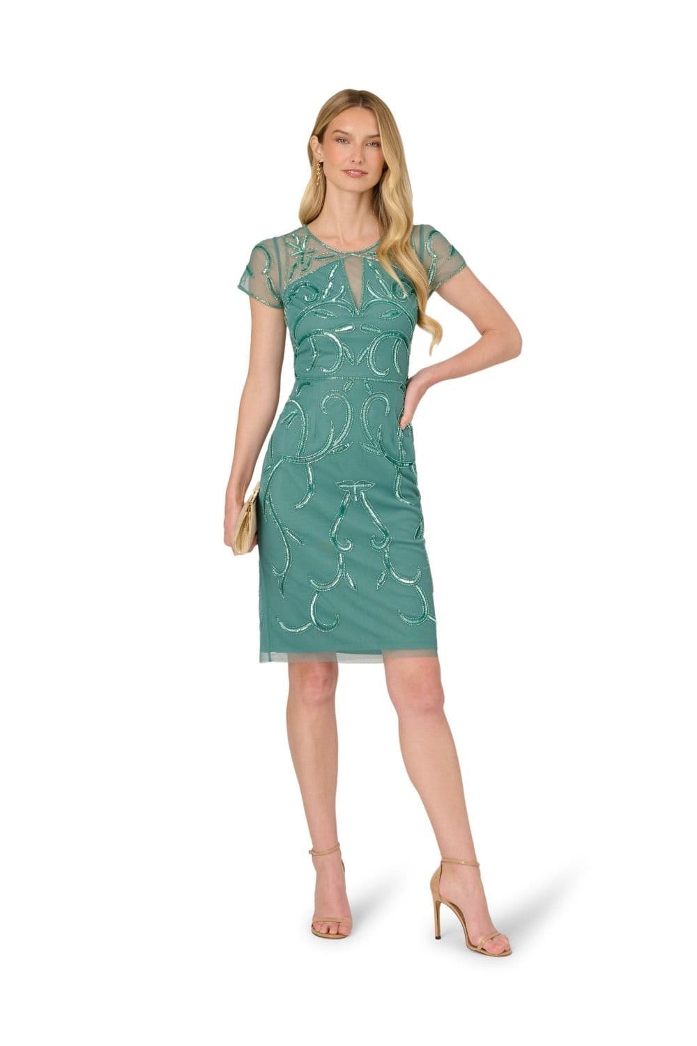 This elegant sheath dress in green is perfect for special occasions. Featuring a sheer mesh overlay with hand-sewn beads and sequins, it has a knee-length silhouette and sheer cap sleeves for a touch of lightness.