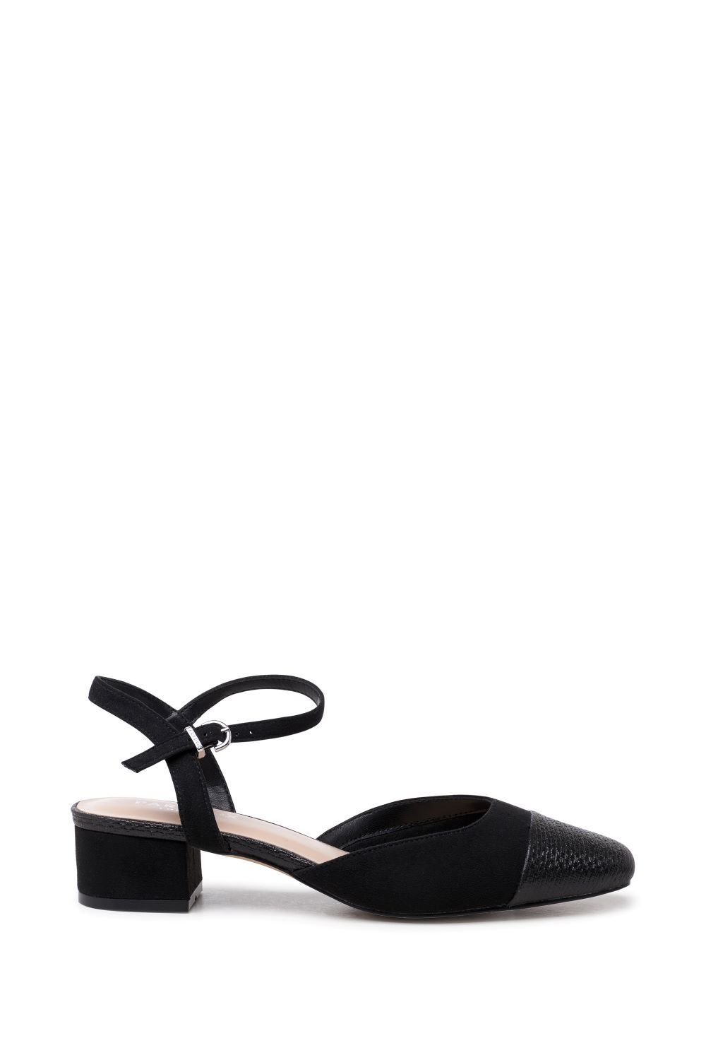 Stylish black low heel open court shoes by Paradox London. Featuring a square toe, adjustable ankle strap, and a chunky block heel for a timeless look. Ideal for casual and evening wear.