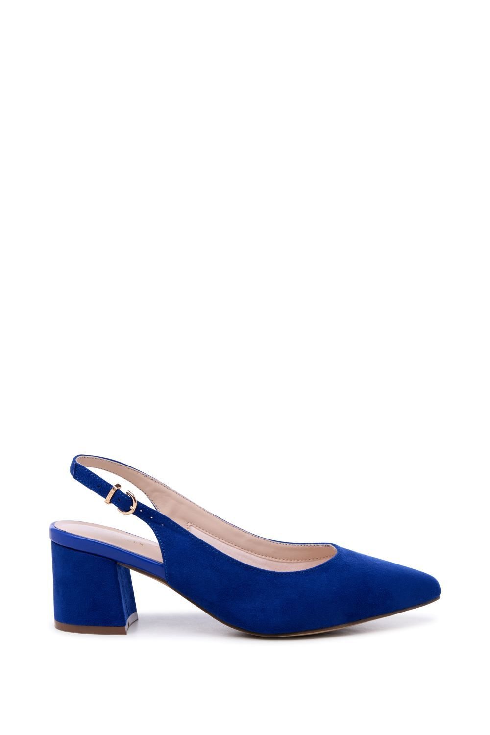 Stylish blue suede sling back court shoes by Paradox London. Featuring a closed toe and a mid block heel, these shoes are perfect for smart-casual occasions.