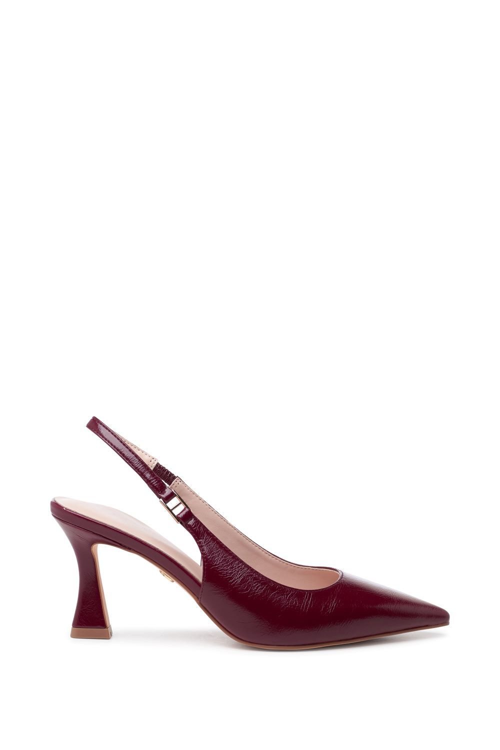 Sophisticated high heel sling back court shoes in burgundy leather. Featuring a flared heel for comfort and an elasticated ankle strap for a perfect fit. Ideal for both day and night.
