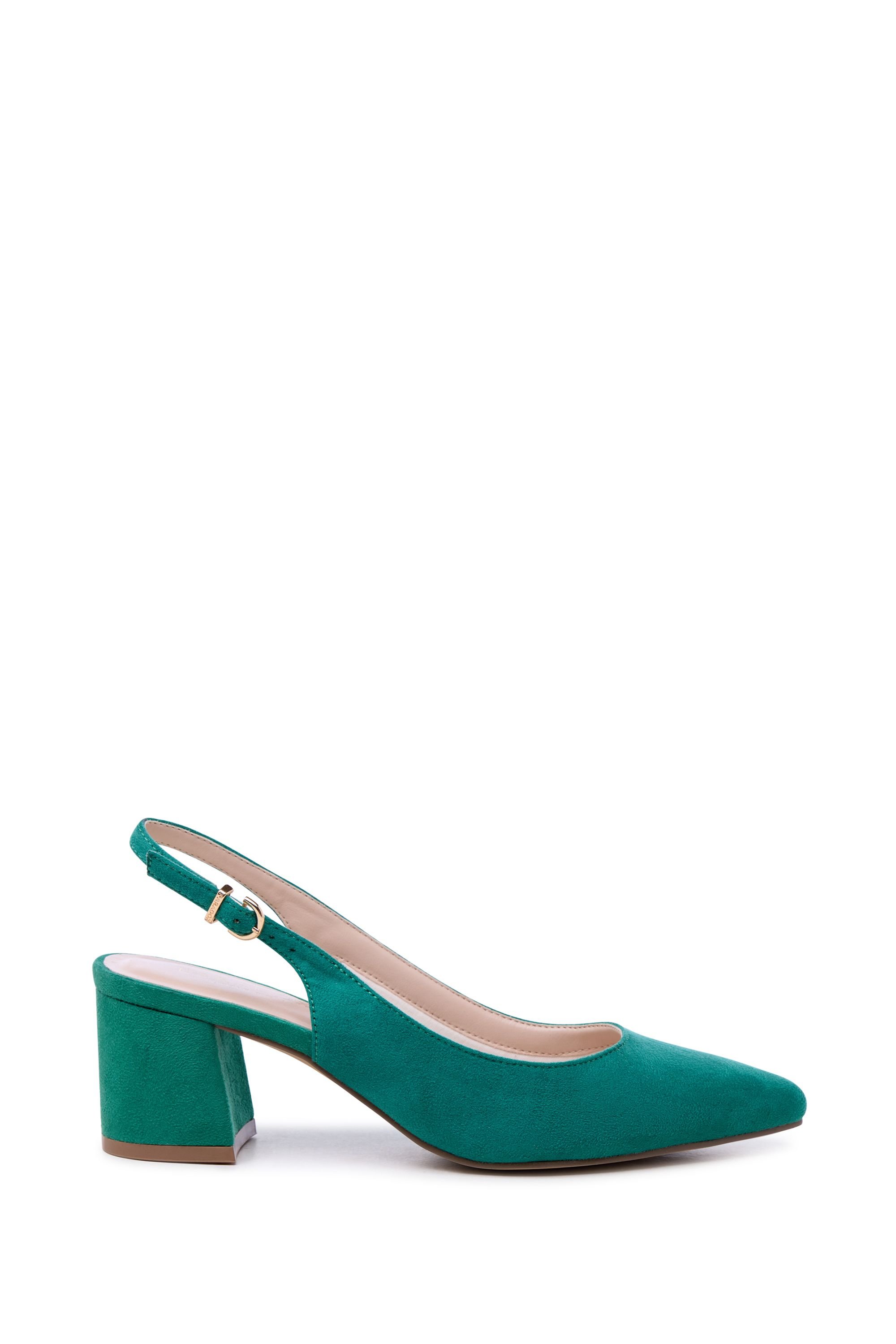 Stylish Paradox London court shoes in emerald suede. Featuring a block heel and slingback strap, these shoes are perfect for transitioning from day to night. The padded insole ensures comfort throughout the day.