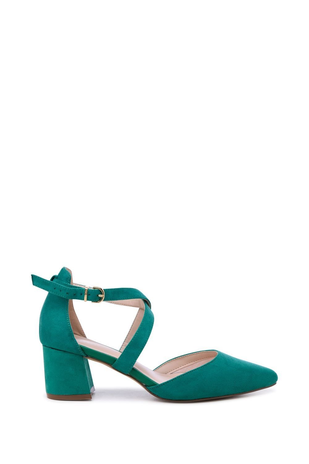 Chic block heel court shoe by Paradox London in green micro suede. Features a cross strap detail and a comfortable block heel. Perfect for transitioning from day to night.