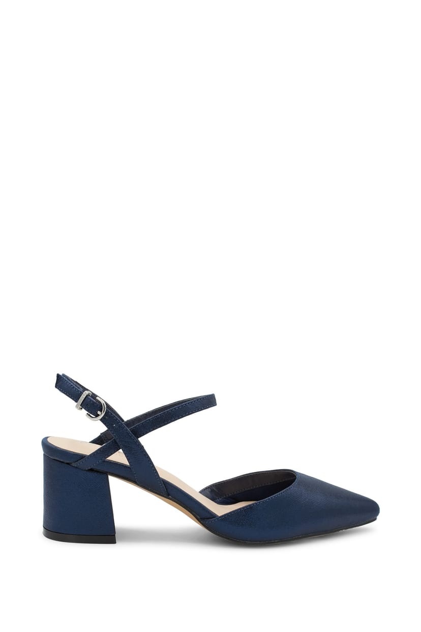 Stylish Navy leather court shoe with a pointed toe and block heel. Features a chic cross-strap design and triple-layer cushioning for all-day comfort. Ideal for both casual and formal occasions.