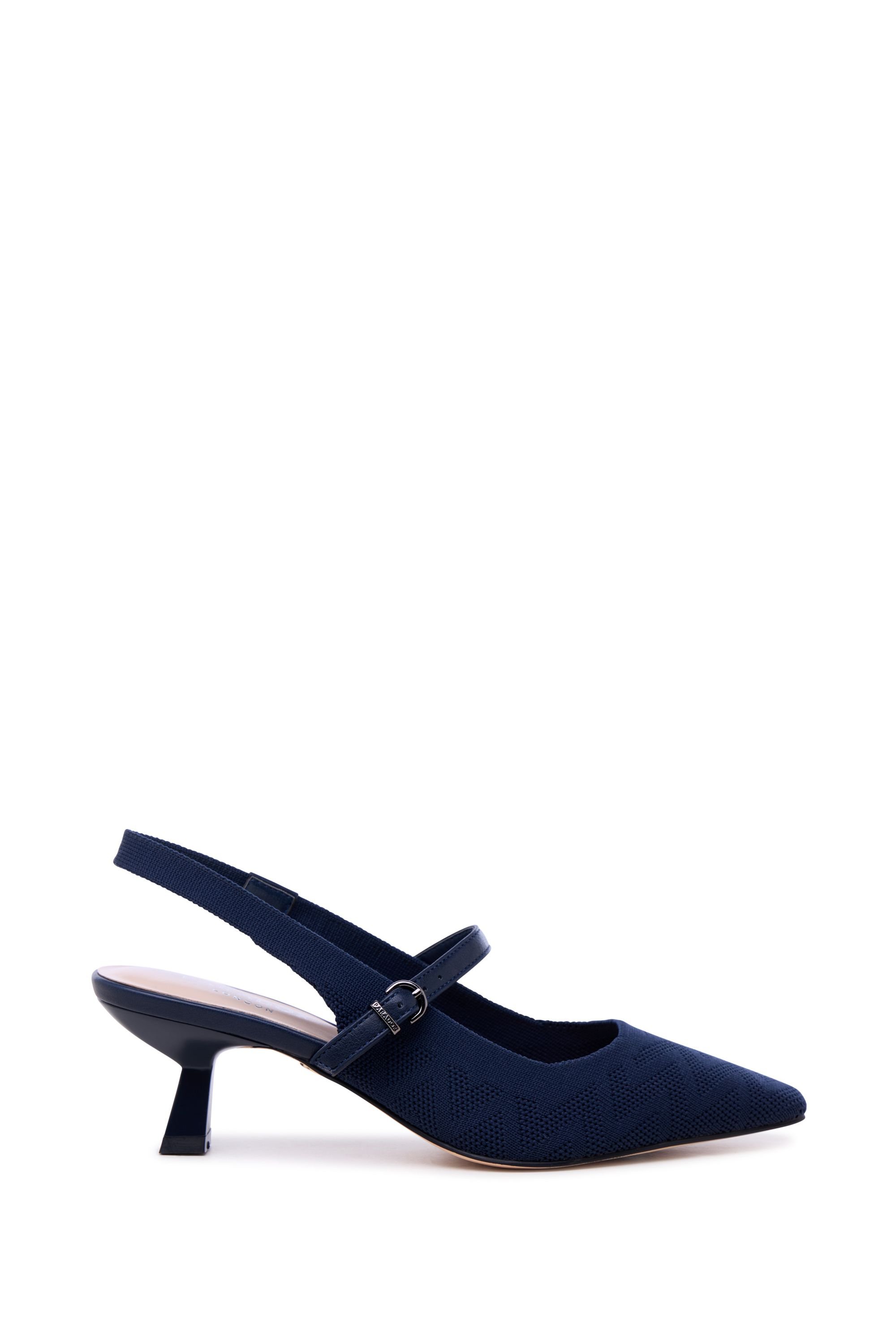 Stylish navy slingback low heel shoes by Paradox London. Crafted with a mesh fabric upper for breathability and a leather sole for durability. Ideal for casual and evening wear.