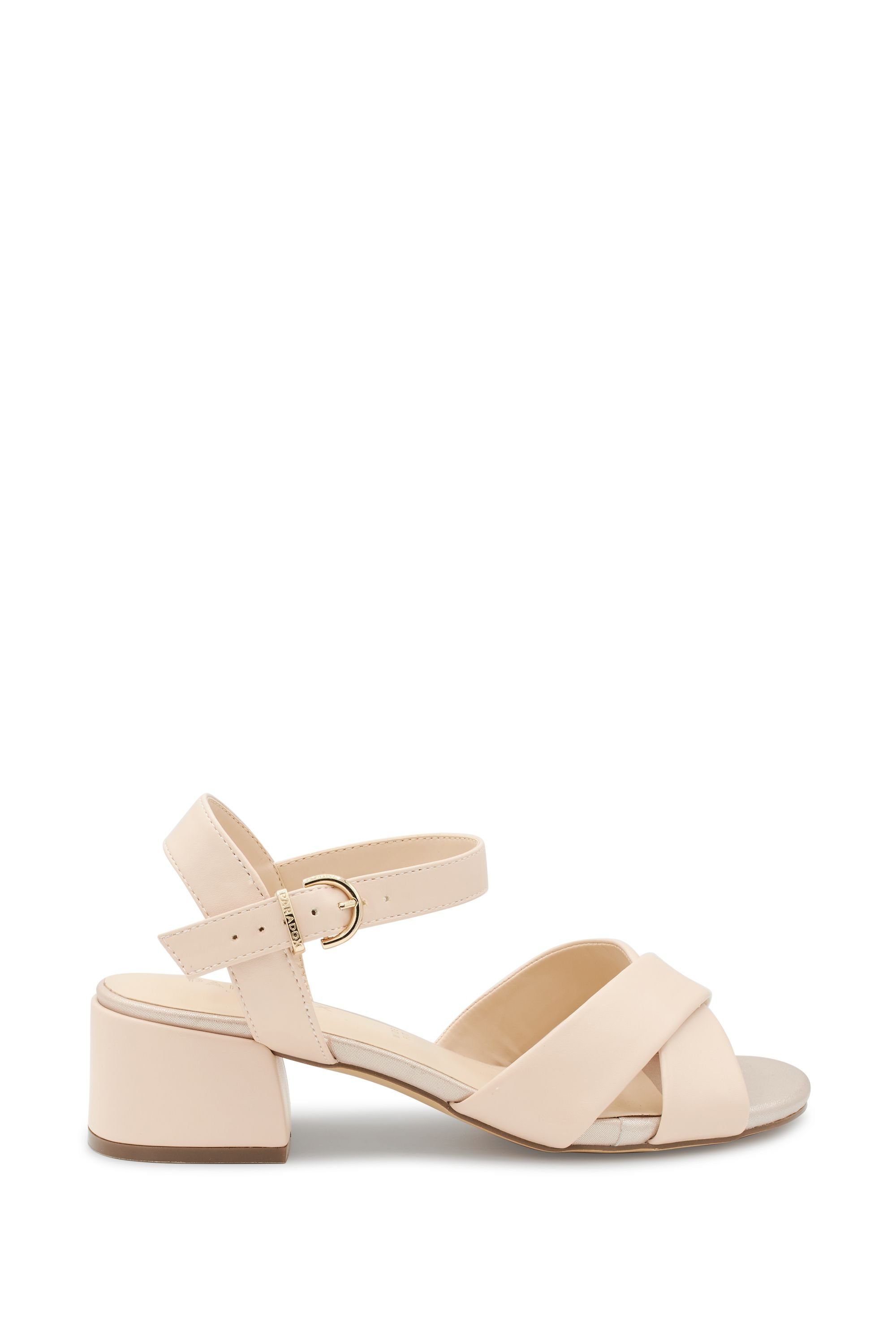 Stylish Nude Paradox London Neala sandals with a wide fit design. Featuring a comfortable low block heel, crisscross straps, and an ankle fastening for added security. Ideal for special occasions.