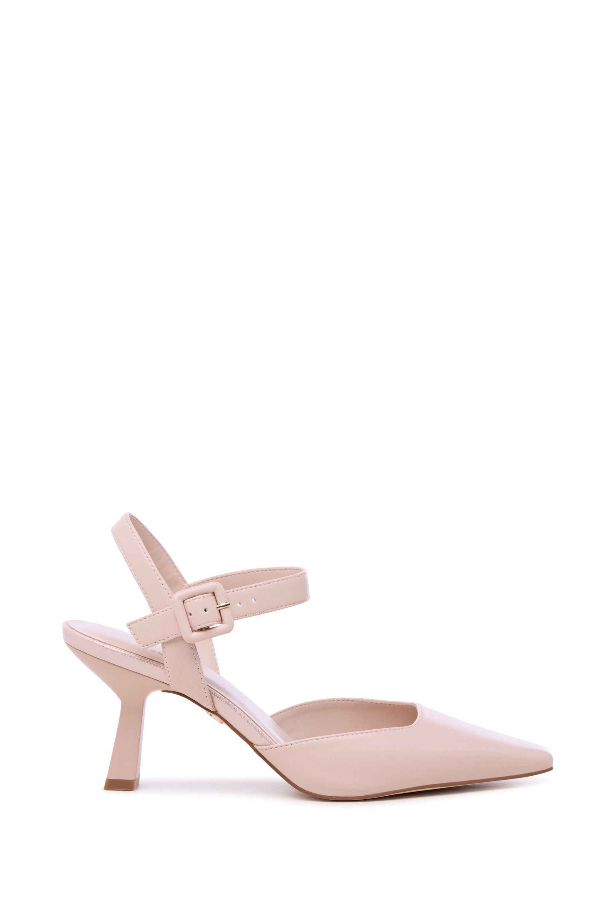 Chic mid-heel courts in nude with a pointed toe and ankle strap. The simple silhouette makes them perfect for any occasion.