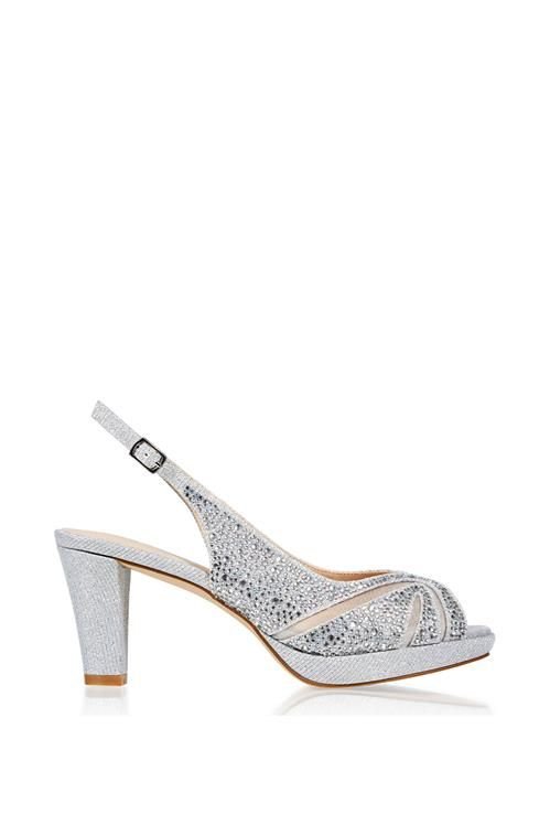 Elegant silver glitter 'Linda' sling back sandal by Paradox London. Featuring a soft mesh base with crystal detailing, this shoe offers a small platform and thick heel for added comfort and style. Ideal for special occasions.