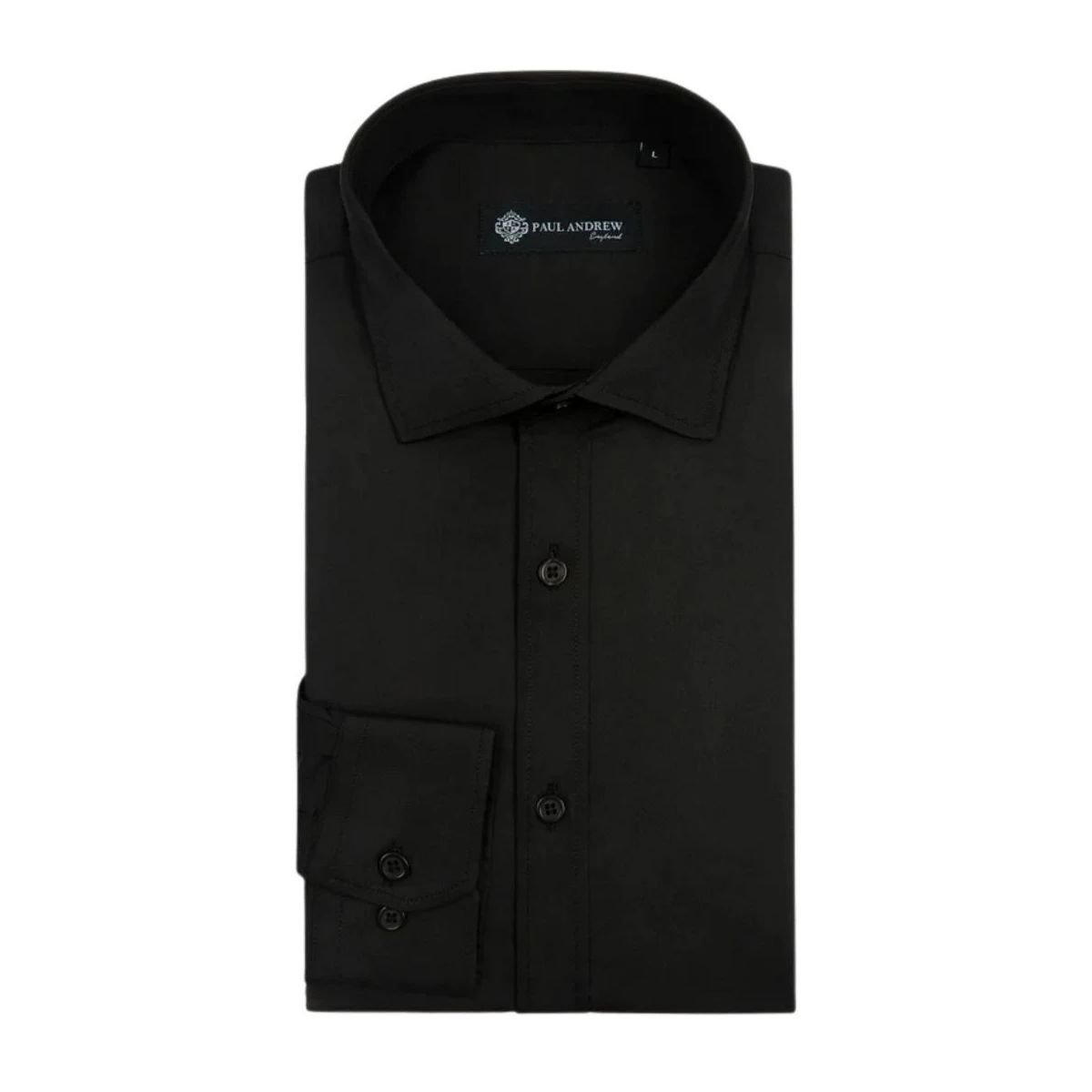 Elegant black double cuff dress shirt by Paul Andrew. Features a modern cutaway collar and a tailored design for a sophisticated look. Ideal for business, weddings, and special occasions.
