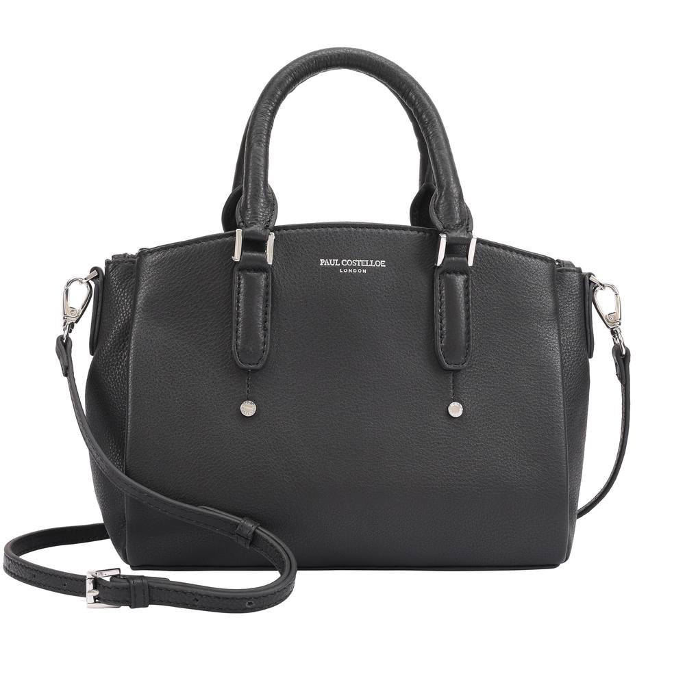 Stylish black leather handbag by Paul Costelloe with a softly structured silhouette. Features both top handles and a detachable shoulder strap for versatile carrying options. Ideal for refined everyday wear.