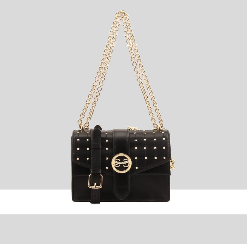 Elegant black leather crossbody bag with a chain shoulder strap and stud-embellished front flap. Designed for a glamorous evening look.
