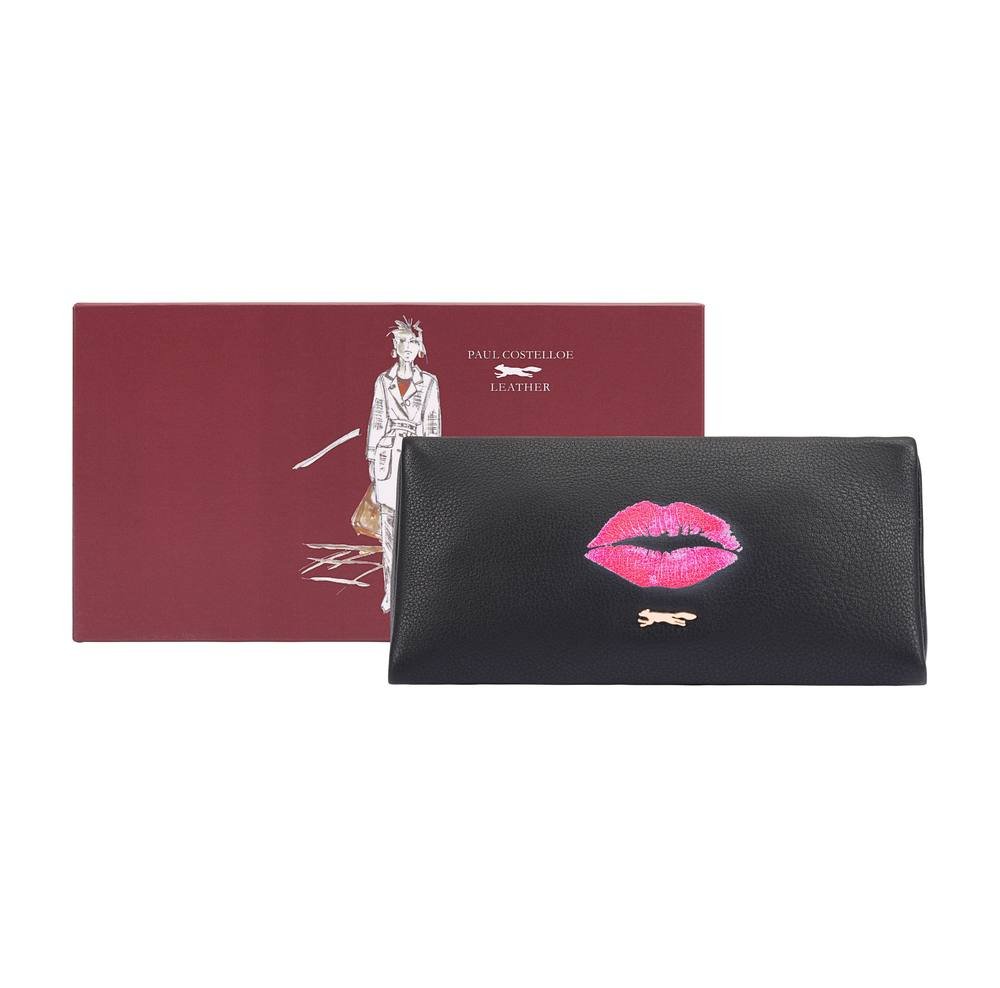 Stylish black leather pouch from Paul Costelloe. The TULLU case is perfect for carrying your daily makeup essentials. Its chic design and pink lips logo make it a fashionable accessory for any occasion.
